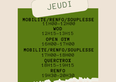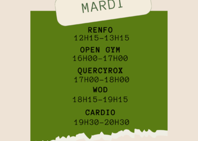Les séances de renforcement se basent sur des exercices fondamentaux comme les squats, les deadlifts, les presses et les tractions, souvent réalisés avec des charges progressives. Ces exercices permettent de renforcer l’ensemble de votre corps, en ciblant particulièrement les muscles sollicités dans les WOD