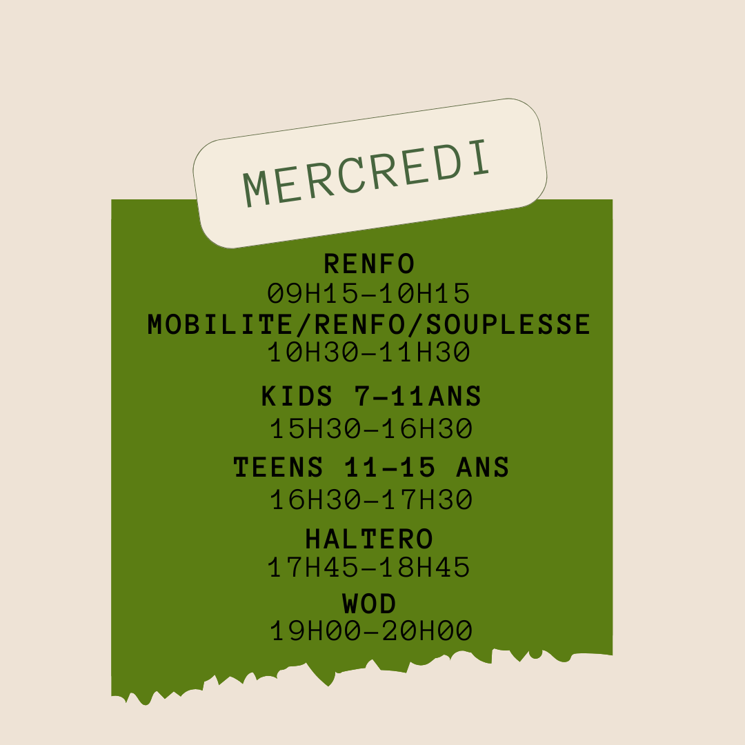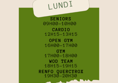 L’acronyme qui définit l’essence même de notre sport: un entraînement varié et intense qui change chaque jour. Composé d’exercices de musculation, cardio et gymnastique, le WOD vous pousse à vos limites, développant votre condition physique globale de manière ludique et stimulante.
