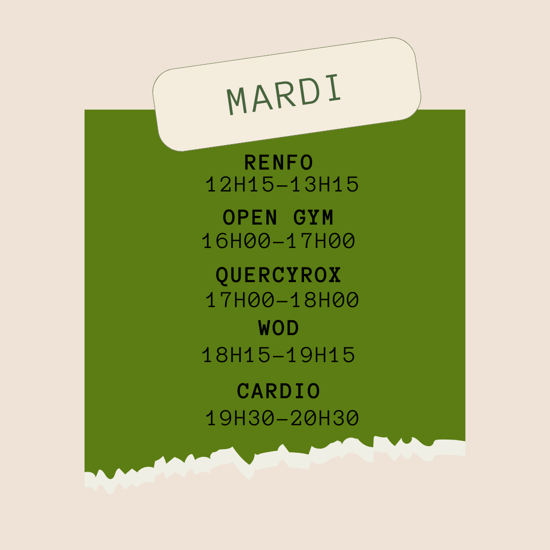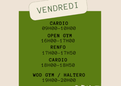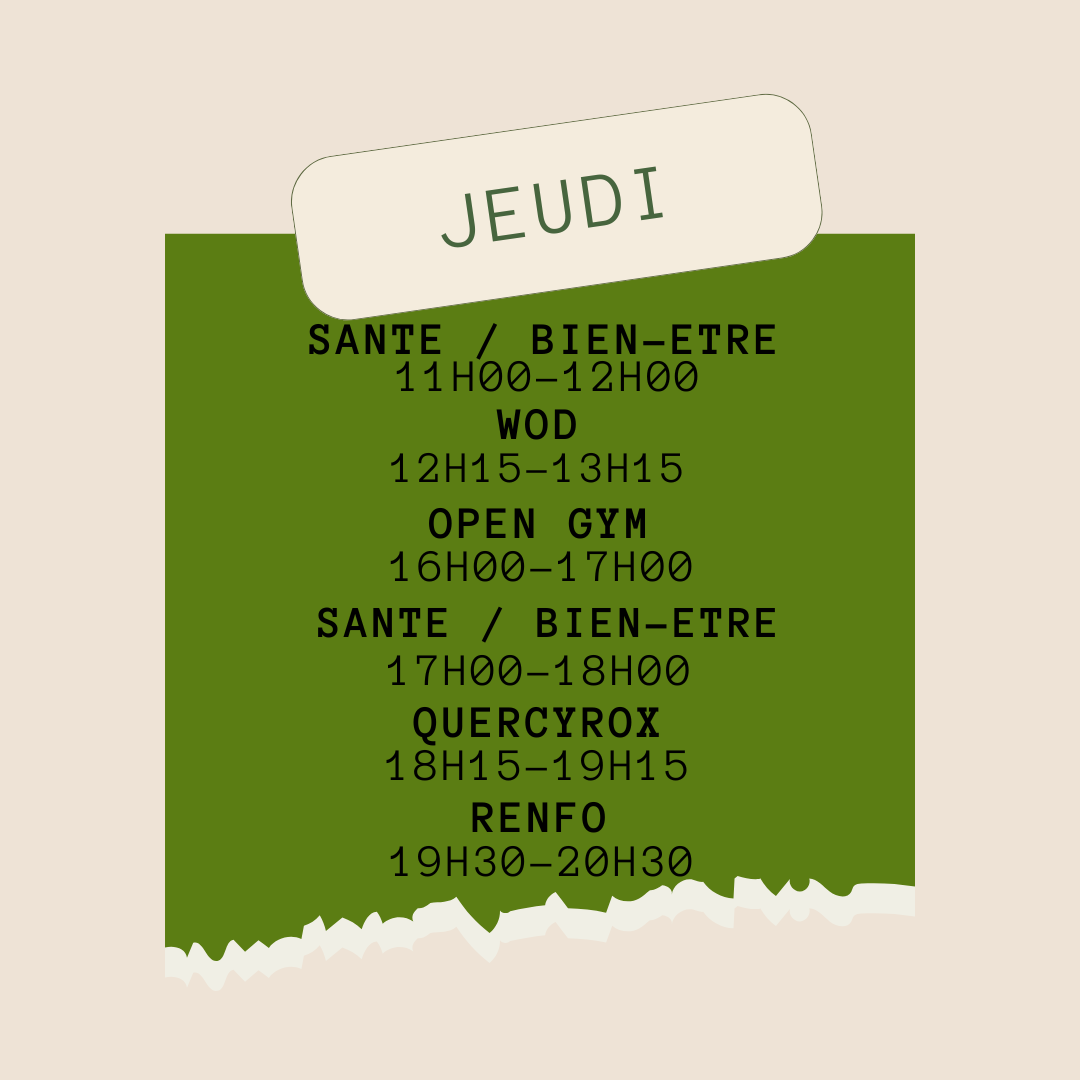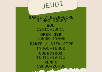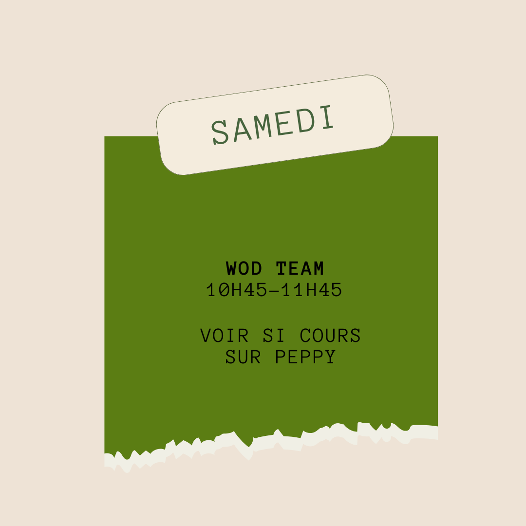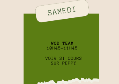Le coach propose un WOD spécifique composé d’exercices variés (gymnastique, haltérophilie, cardio) et de répétitions/temps défini. Vous devez collaborer avec votre ou vos coéquipiers pour accomplir le WOD dans le temps imparti, en respectant la répartition des tâches et des charges.