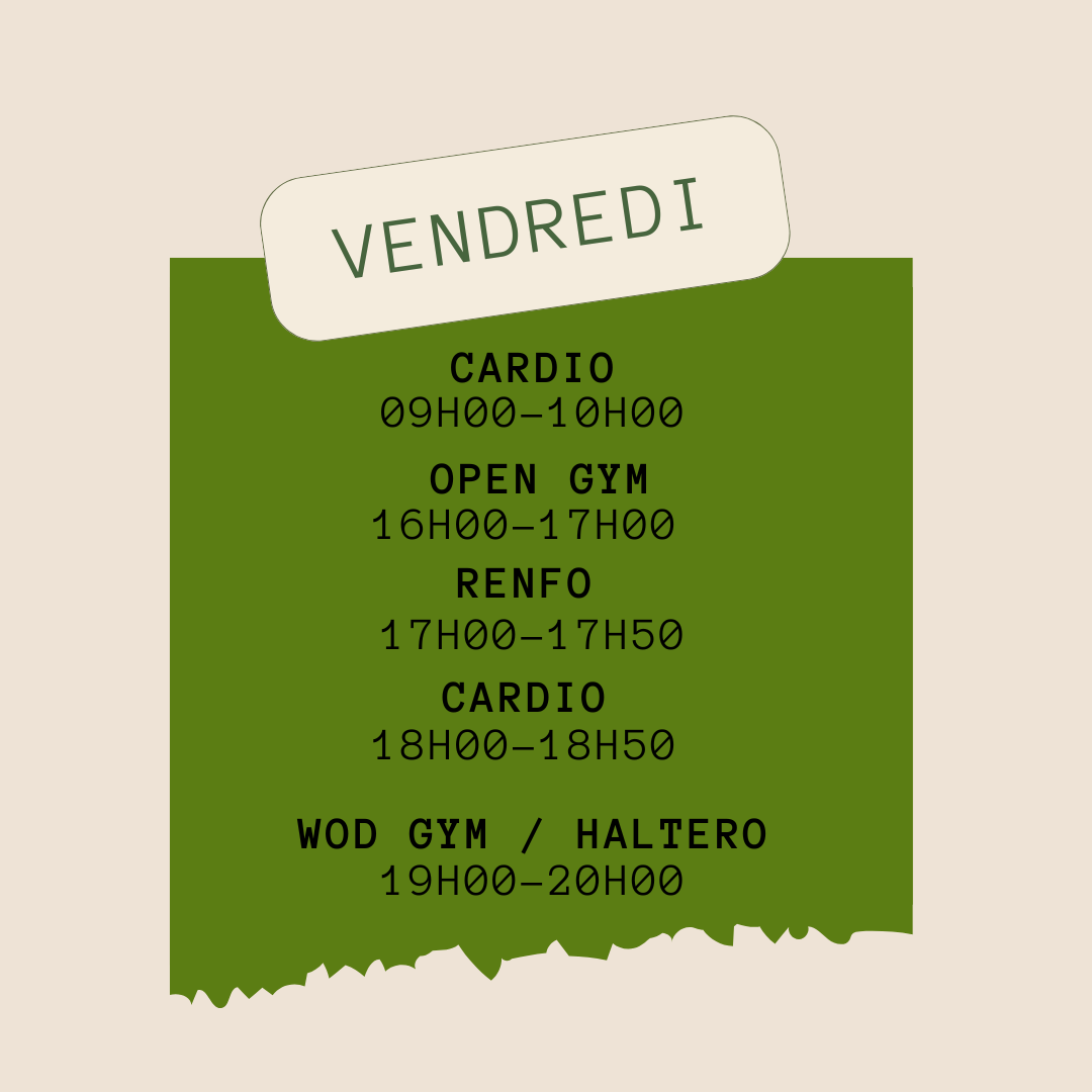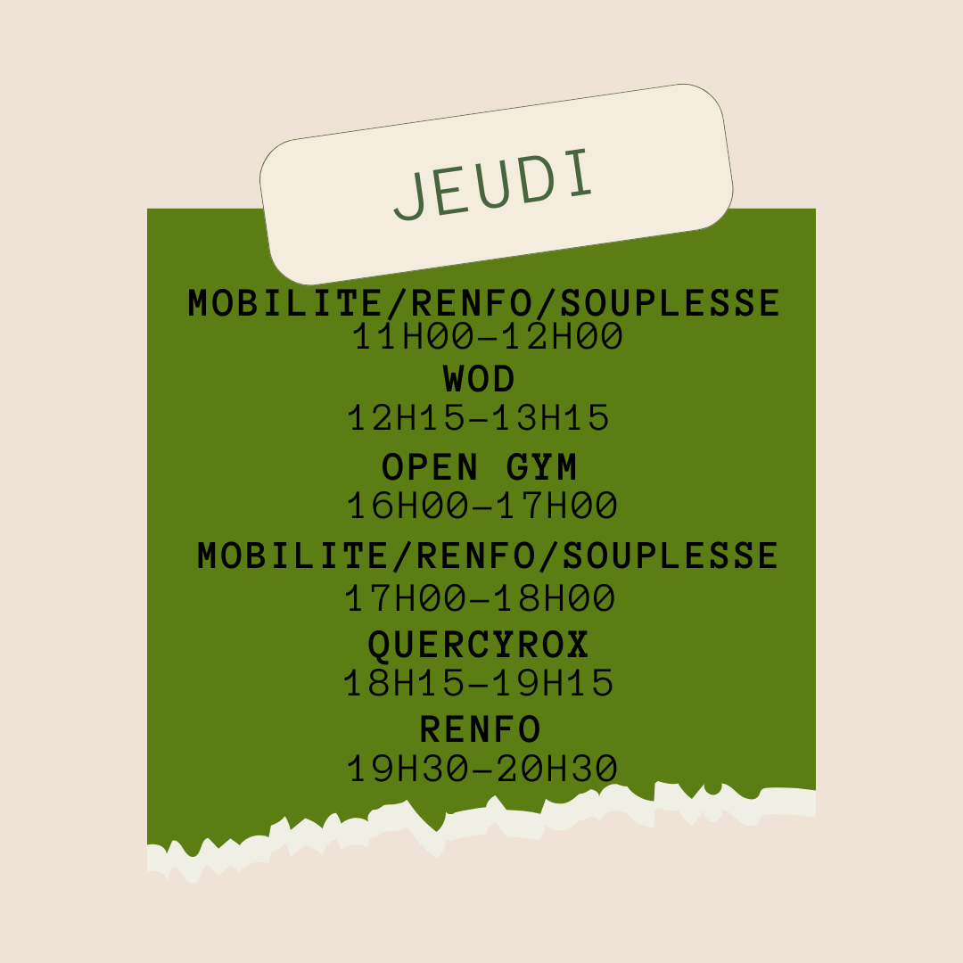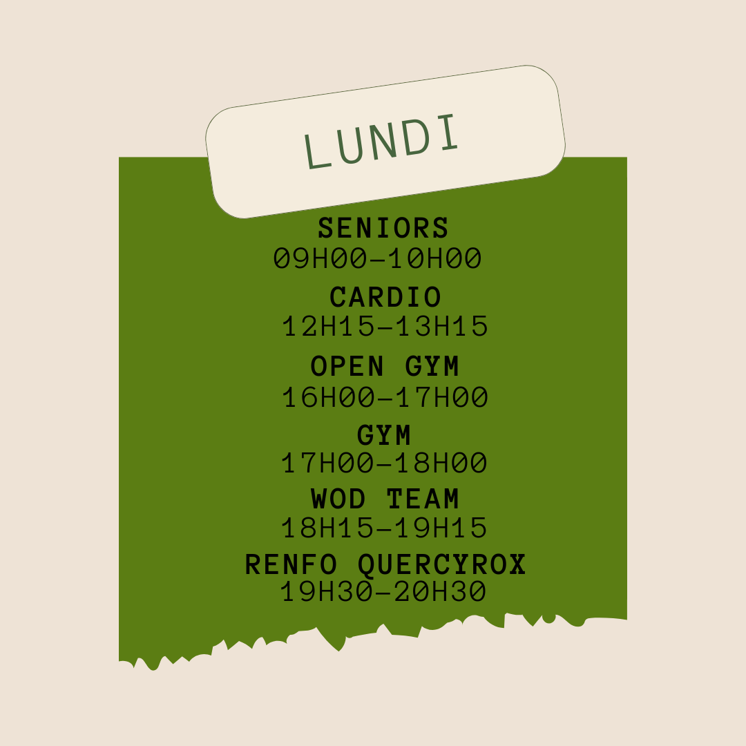 Le coach propose un WOD spécifique composé d’exercices variés (gymnastique, haltérophilie, cardio) et de répétitions/temps défini. Vous devez collaborer avec votre ou vos coéquipiers pour accomplir le WOD dans le temps imparti, en respectant la répartition des tâches et des charges.